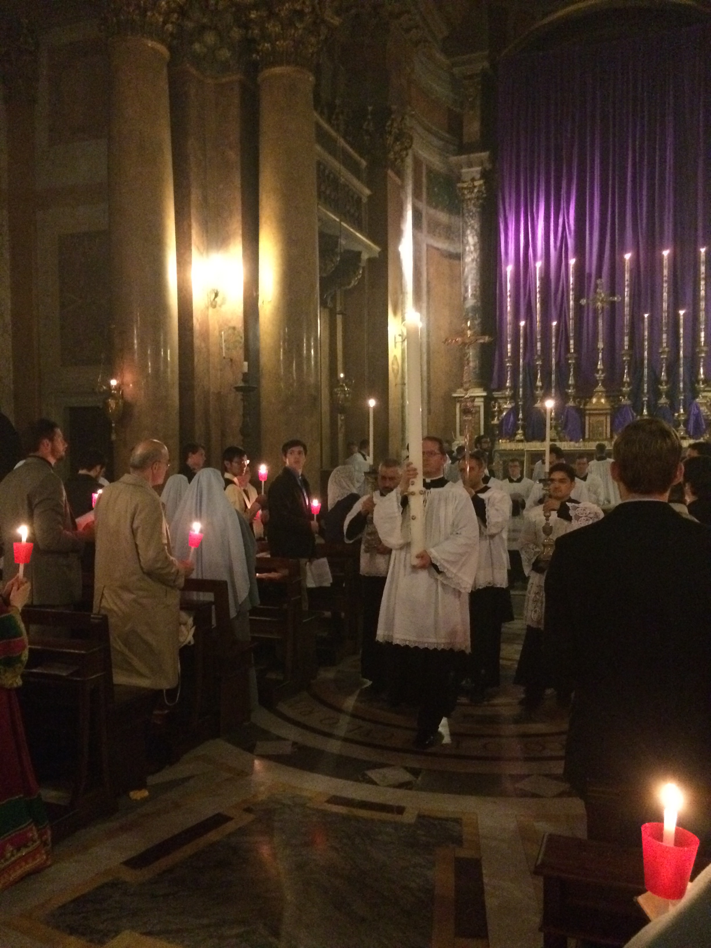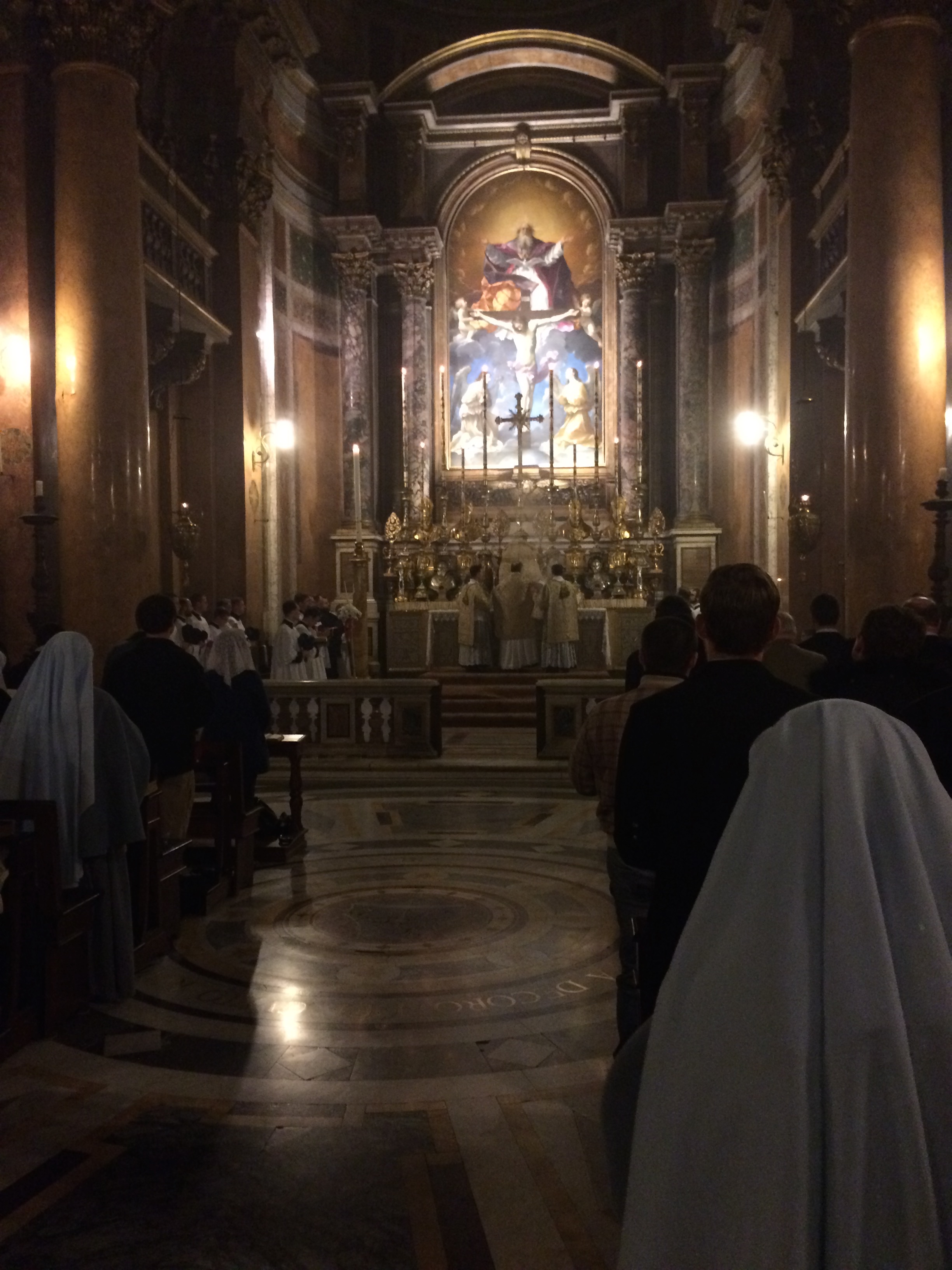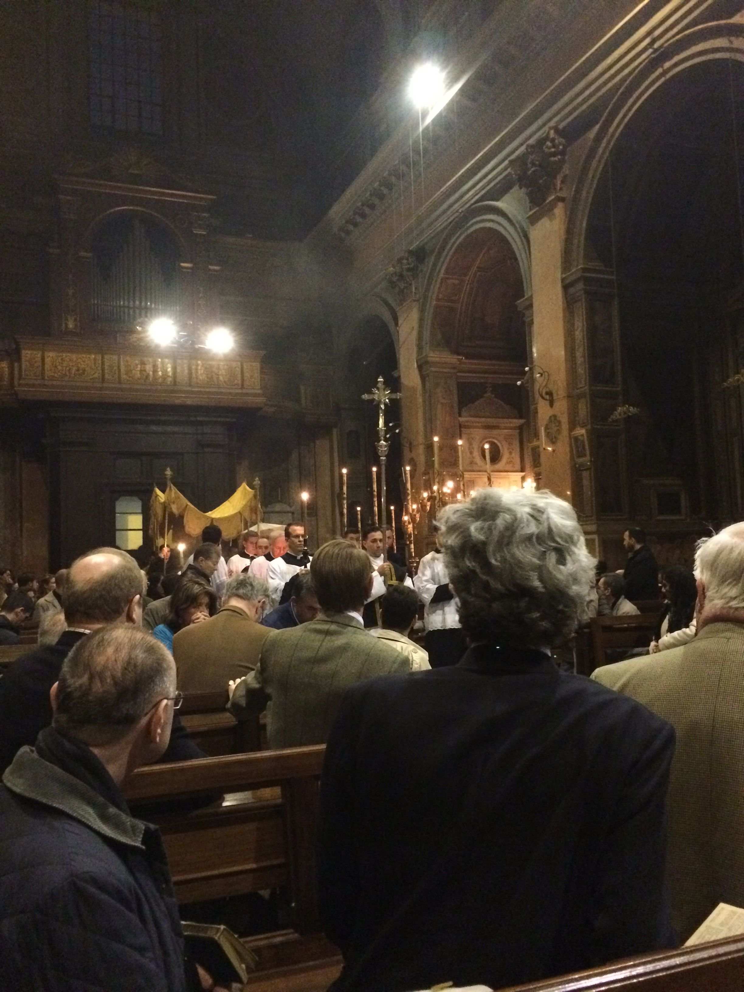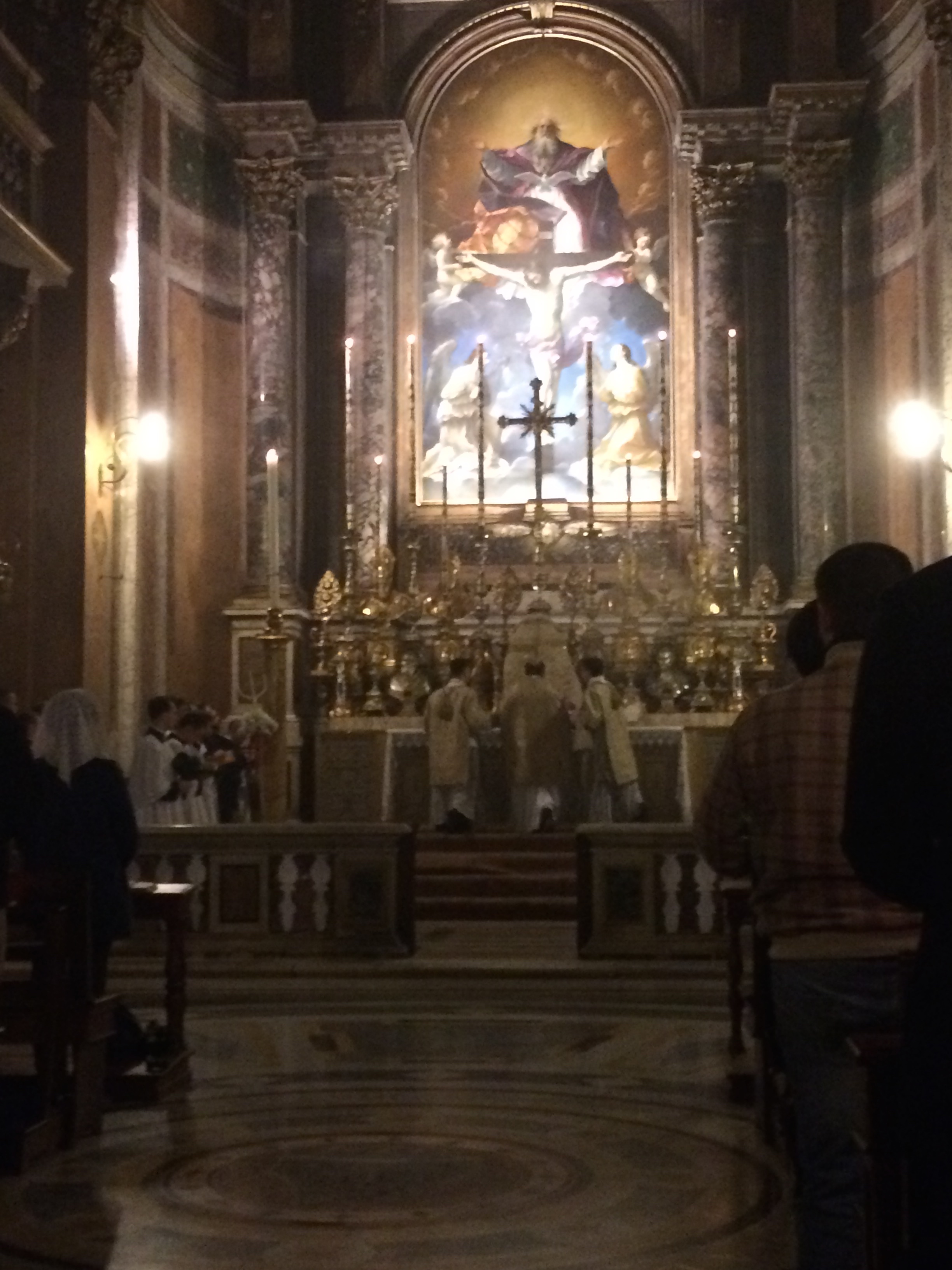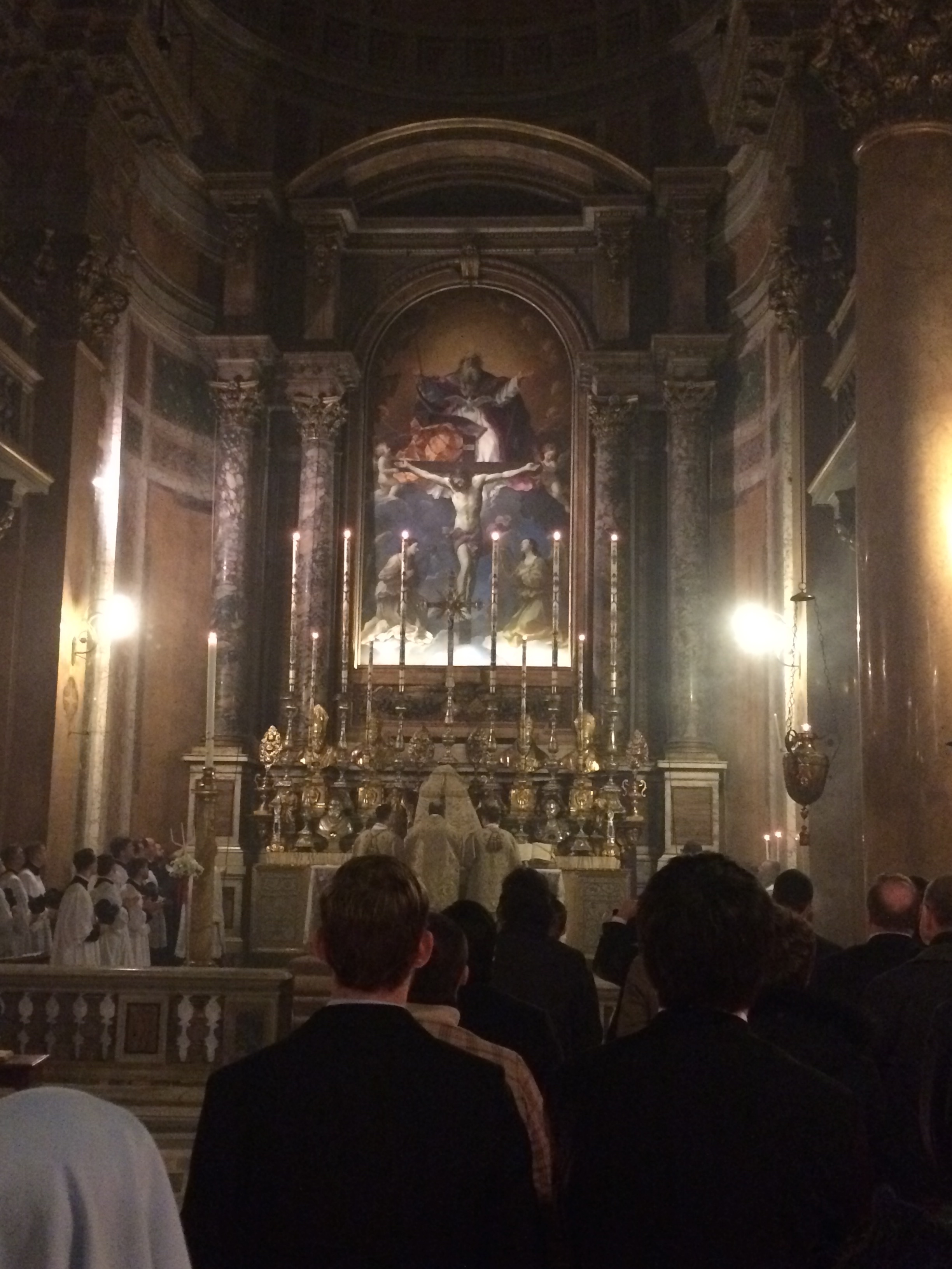Nell’augurare a tutti i lettori una Santa Pasqua, pubblico alcune foto del Triduo pasquale in rito antico presso la Parrocchia Personale della SS.ma Trinità dei Pellegrini a Roma. Tutte le celebrazioni hanno visto una grandissima affluenza di fedeli, accorsi da più parti dell’Urbe e dell’Orbe, tanto che per trovare un posto era necessario raggiungere la Chiesa almeno mezz’ora prima dell’inizio delle celebrazioni. Questo è un evidente segno del fatto che la fedeltà alle rubriche non è solo un’inutile formalismo, ma anzi è molto apprezzata dai fedeli (e da Dio innanzitutto!), i quali spesso affrontano notevoli sacrifici economici e non solo per poter assistere a questi riti celebrati veramente come Dio comanda! Ci si augura che l’esempio degli ottimi e preparatissimi Sacerdoti e Ministranti della Parrocchia Personale della SS.ma Trinità dei Pellegrini sia seguito in tutte le Chiese in cui si applica il motu proprio «Summorum Pontificum» di Benedetto XVI.