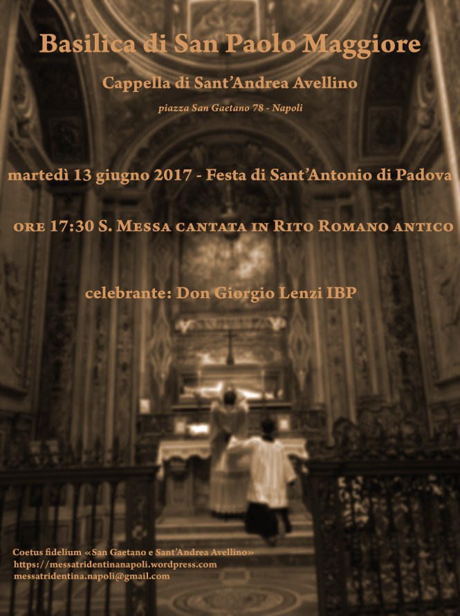 Come annunziato in precedenza su questo blog, lo scorso martedì 13 giugno 2017 (ore 17:30), nella Cappella di Sant’Andrea Avellino della Basilica di San Paolo Maggiore (Napoli), è stata celebrata la S. Messa cantata secondo l'”Usus antiquior” del Rito Romano in onore di Sant’Antonio di Padova.