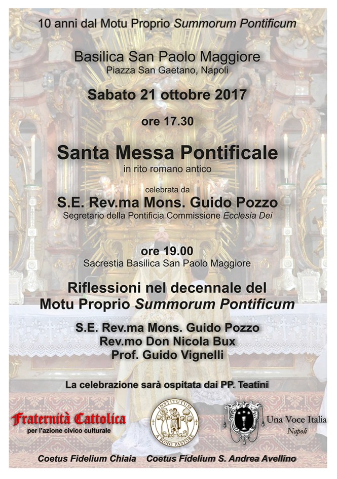 Negli Annali del movimento liturgico tradizionale a Napoli, quanto accaduto lo scorso 21 ottobre occuperà un posto di assoluto rilievo: la celebrazione della prima S. Messa Pontificale al Faldistorio nell’usus antiquior del Rito Romano dopo la riforma liturgica del secolo scorso. Il Santo Sacrificio della Messa è stato offerto da Sua Eccellenza Reverendissima Mons. Guido Pozzo, Segretario della Pontificia Commissione «Ecclesia Dei», nella maestosa cornice della Basilica di San Paolo Maggiore, gloria dell’architettura sacra partenopea, retta dai RR. PP. Teatini. Ordinarium e Proprium Missae, in polifonia e in canto gregoriano, sono stati eseguiti dalla Corale Soli Deo Gloria, diretta dal M° P. Rosario Cantone, e da membri del Coetus fidelium «San Gaetano e Sant’Andrea Avellino», che, assieme alla Comunità Teatina, ha fornito anche il servizio all’Altare. Il sacro rito è stato diretto dal Rev.do Don Giorgio Lenzi, IBP, in qualità di cerimoniere, mentre i ruoli di Diacono, Suddiacono e Prete Assistente sono stati espletati rispettivamente dai Rev.di Don Matthieu Raffray IBP, Don Cristiano Piseddu (Arcidiocesi di Cagliari) e Don William Barker FSSP. Alla celebrazione hanno devotamente assistito oltre sessanta fedeli, senza contare i numerosi turisti, attratti dallo splendore della Sacra Liturgia.