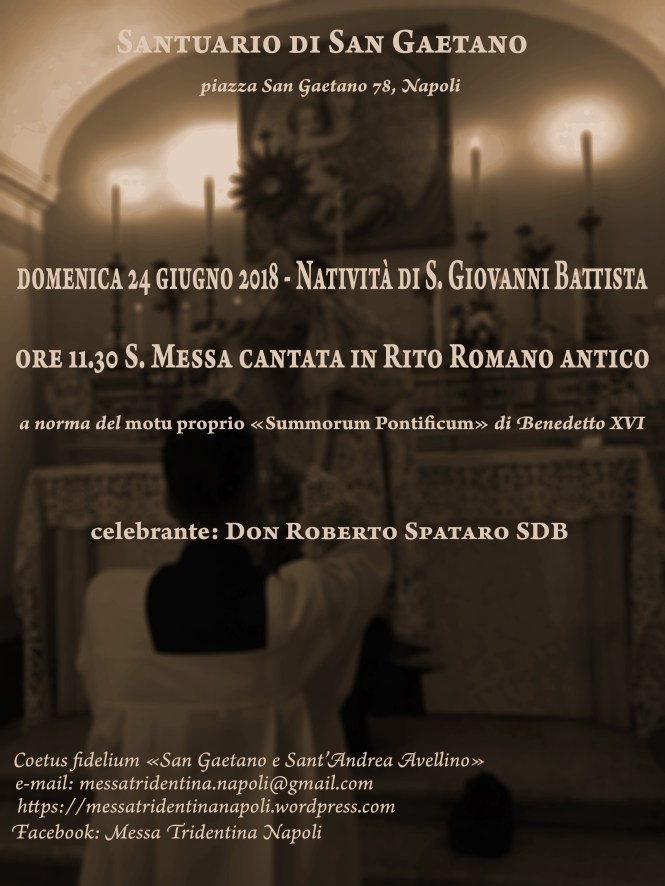 Napoli, Domenica 24 giugno 2018, Natività di San Giovanni Battista: S. Messa cantata in Rito Romano antico (D. Spataro) Immagine23 giugno 201823 giugno 2018messatridentinanapoli Lascia un commento Condividi: Fai clic per condividere su X (Si apre in una nuova finestra) X Fai clic per condividere su Facebook (Si apre in una nuova finestra) Facebook Fai clic per condividere su Telegram (Si apre in una nuova finestra) Telegram Fai clic per condividere su WhatsApp (Si apre in una nuova finestra) WhatsApp Mi piace Caricamento... Correlati