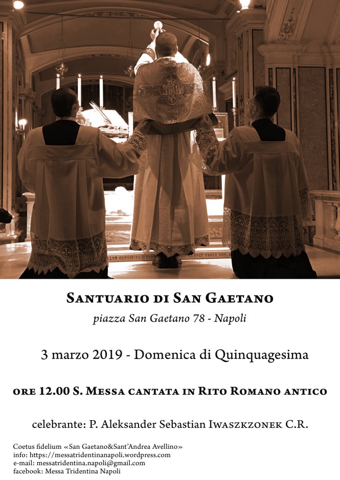 Napoli, 3 marzo 2019, Domenica di Quinquagesima: S. Messa cantata in Rito Romano antico alle ore 12.00 (P. Aleksander) 1 marzo 20191 marzo 2019messatridentinanapoli Lascia un commento Domenica 3 marzo la S. Messa tradizionale nel Santuario di San Gaetano sarà eccezionalmente celebrata alle ore 12.00. Da domenica 10 c.m. si ritornerà al consueto orario (11.30).