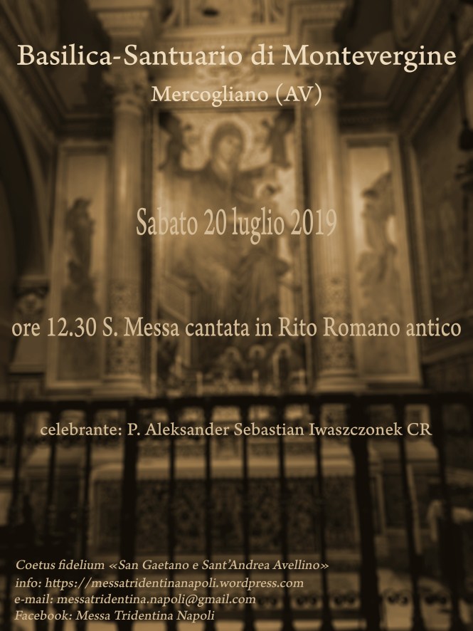 Il prossimo sabato 20 luglio, come già lo scorso anno, il Coetus fidelium «San Gaetano & Sant’Andrea Avellino» si recherà in pellegrinaggio presso l’Abbazia di Montevergine (AV). Alle ore 12.30 P. Aleksander Sebastian Iwaszczonek CR celebrerà la S. Messa cantata secondo l’usus antiquior del Rito Romano nella Cappella della Madonna. La partecipazione è aperta a tutti (trasporto con mezzi proprî). L’appuntamento è per le 12.00 ca. presso il luogo della celebrazione, per la recita del S. Rosario.