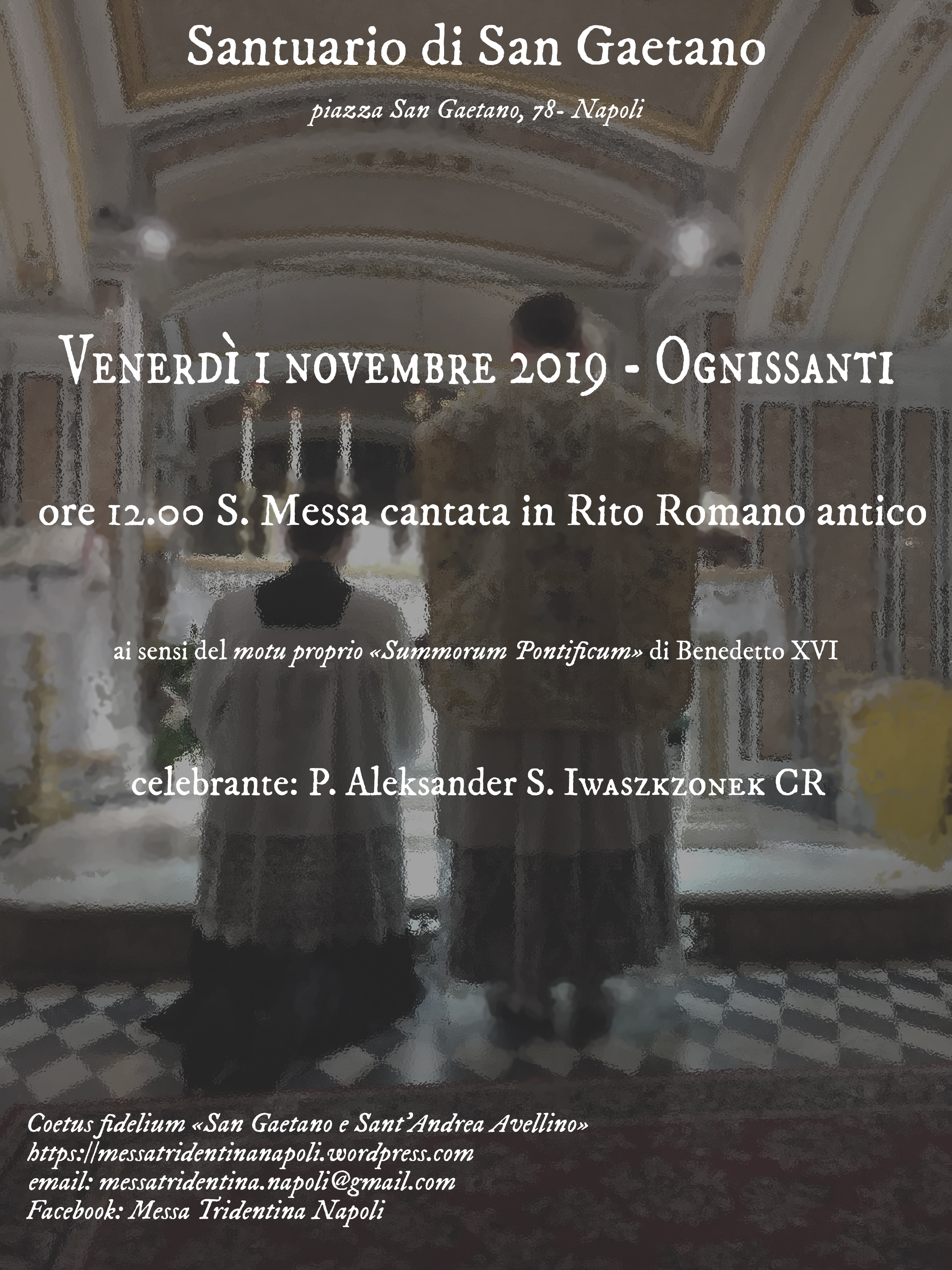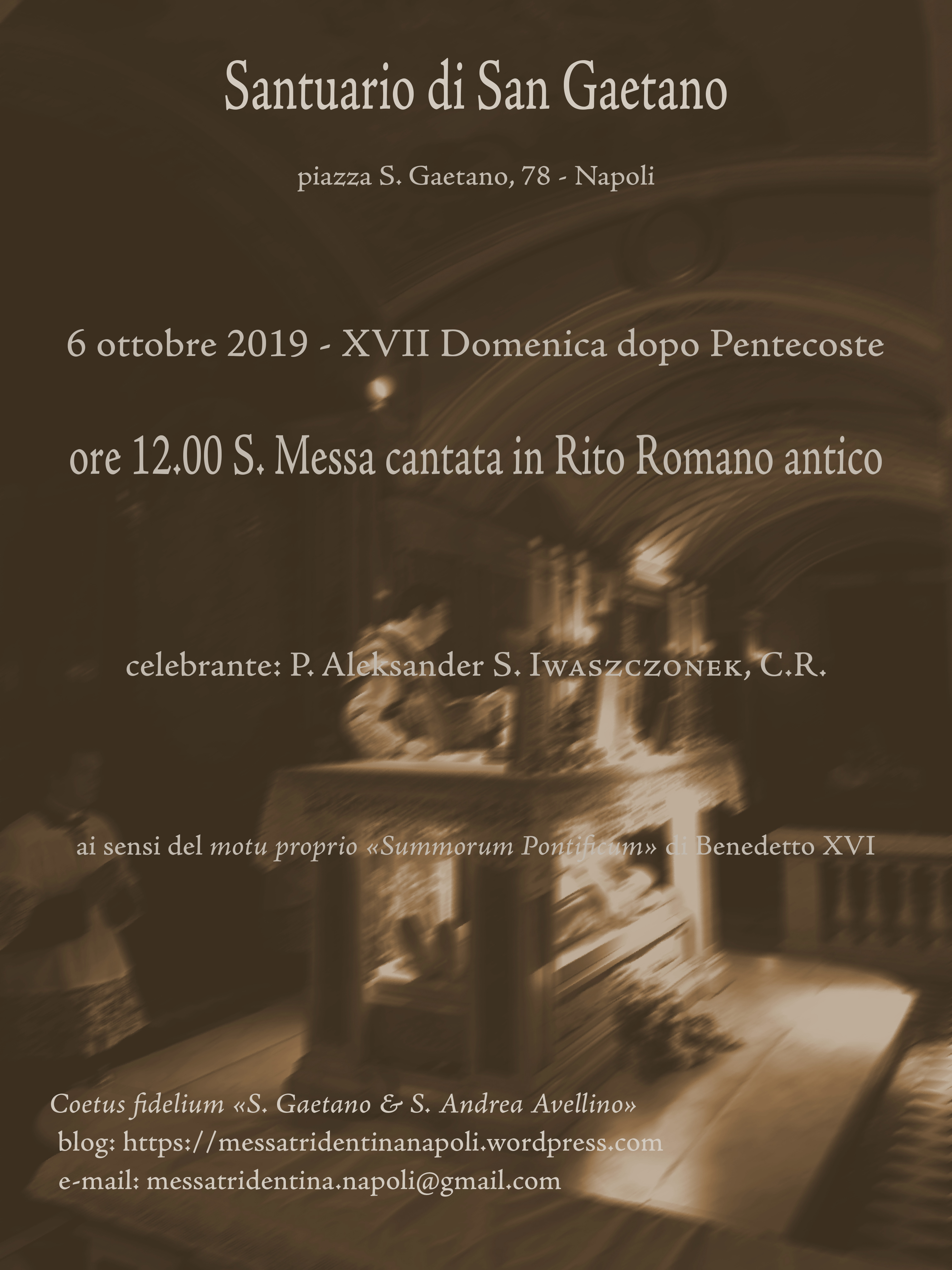 Sabato 19 ottobre, inoltre, sarà celebrata una S. Messa in Rito Romano antico nella Basilica di San Paolo Maggiore, Cappella di S. Andrea Avellino, ore 11.30.