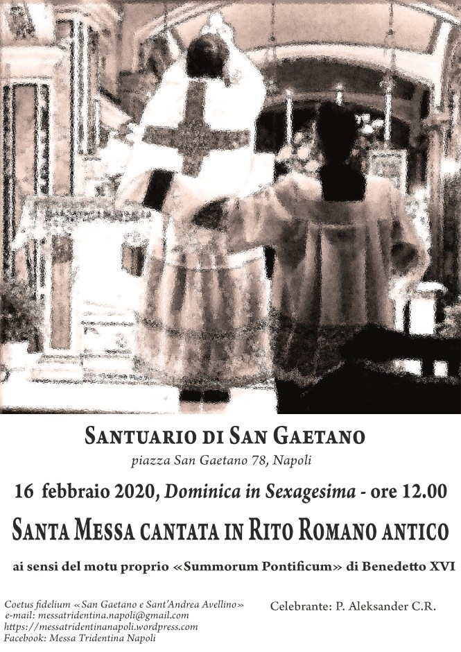 Napoli, Santuario di San Gaetano, 16 febbraio 2020, Domenica di Sessagesima: S. Messa cantata in Rito Romano antico, ore 12.00 Immagine15 febbraio 202015 febbraio 2020messatridentinanapoli Lascia un commento Condividi: Fai clic per condividere su X (Si apre in una nuova finestra) X Fai clic per condividere su Facebook (Si apre in una nuova finestra) Facebook Fai clic per condividere su Telegram (Si apre in una nuova finestra) Telegram Fai clic per condividere su WhatsApp (Si apre in una nuova finestra) WhatsApp Mi piace Caricamento... Correlati