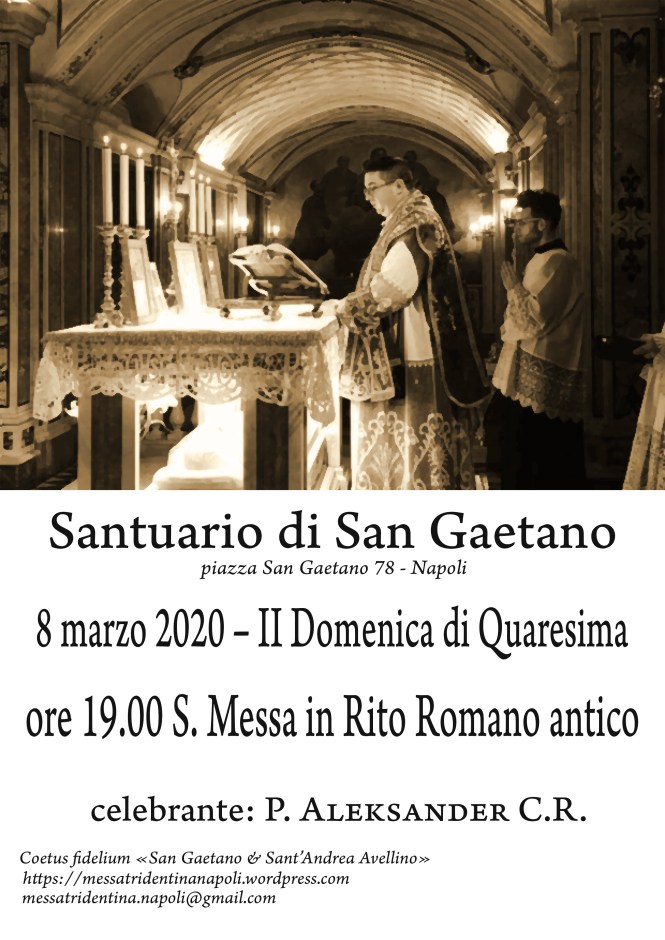 Come P. Aleksander ha solennemente annunziato poc’anzi durante la S. Messa trasmessa in streaming, il nostro Coetus Fidelium «San Gaetano & Sant’Andrea Avellino», ispirandosi agli esempî dell’antica storia di Napoli e, in tempi più recenti, di alcuni parroci della Lombardia, fa voto a San Gaetano, per impetrare la celere fine della pestilenza in atto, di far celebrare, appena sarà possibile, una S. Messa solenne in terzo in Rito Romano antico, seguìta da pubblica processione, in ringraziamento per la sua intercessione, con formulario della Messa votiva di San Gaetano.
