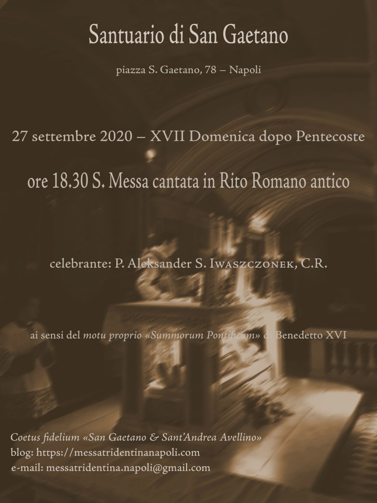 Napoli, Santuario di San Gaetano, 27 settembre 2020, XVII Domenica dopo Pentecoste, ore 18.30: S. Messa cantata in Rito Romano antico Immagine25 settembre 2020messatridentinanapoli Lascia un commento Condividi: Fai clic per condividere su X (Si apre in una nuova finestra) X Fai clic per condividere su Facebook (Si apre in una nuova finestra) Facebook Fai clic per condividere su Telegram (Si apre in una nuova finestra) Telegram Fai clic per condividere su WhatsApp (Si apre in una nuova finestra) WhatsApp Mi piace Caricamento... Correlati
