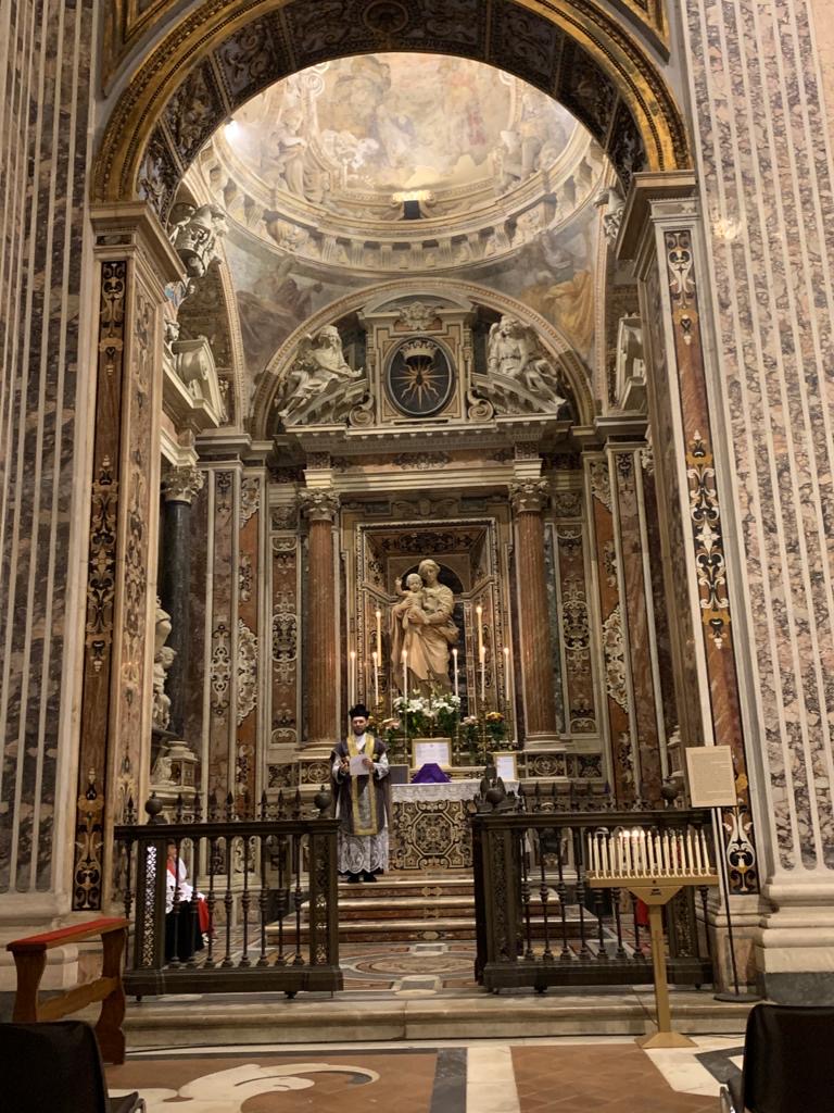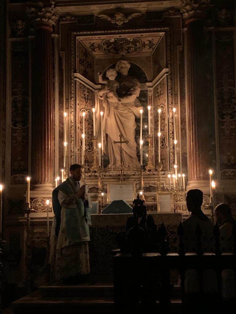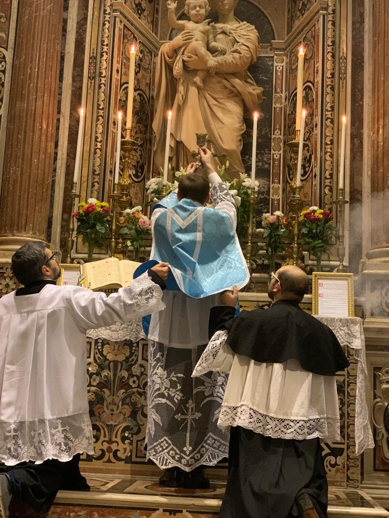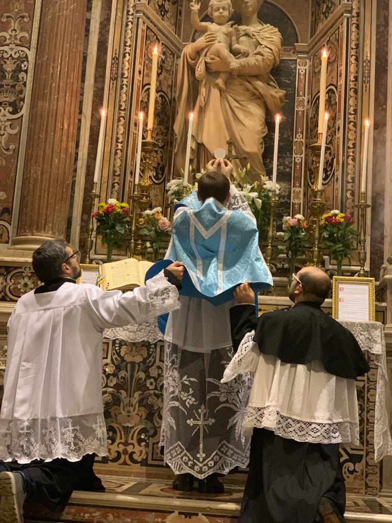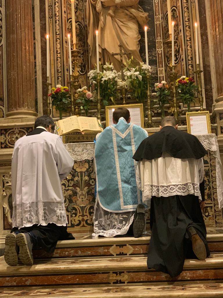 Oggi, lunedí 7 dicembre 2020, nella Basilica di San Paolo Maggiore, alle ore 12.00, è stata celebrata l’ultima S. Messa in Rito Romano antico della Novena in preparazione alla festa dell’Immacolata, offerta per quanti hanno contribuito all’acquisto dei paramenti mariani azzurri ed in suffragio delle Anime Sante del Purgatorio. Ieri, al termine della S. Messa, è stata solennemente benedetta la pianeta azzurra, che sarà impiegata per la prima volta domani, 8 dicembre 2020, durante la S. Messa delle 18.00 in Basilica (vd. locandina supra). Il piviale dovrebbe invece esser pronto prima di Natale.