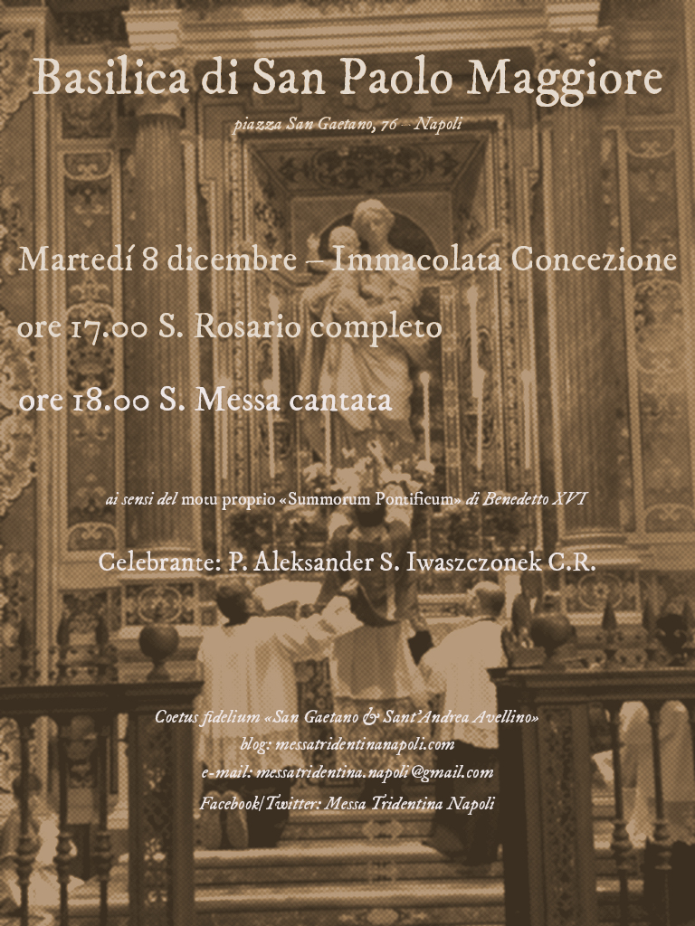 Napoli, Basilica di San Paolo Maggiore, martedí 8 dicembre 2020, festa dell’Immacolata Concezione, ore 18.00: S. Messa cantata in Rito Romano antico