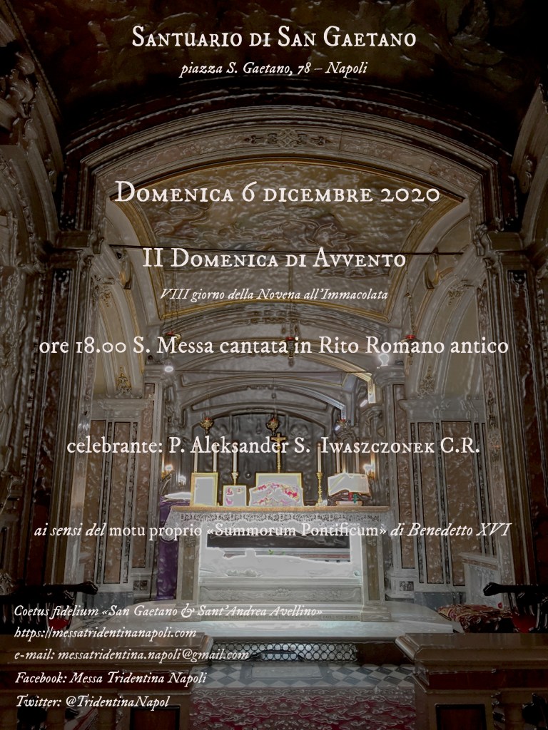 Domani, sabato 5 dicembre 2020, la S. Messa delle 12.00 (nell’àmbito della Novena di Messe tridentine per i benefattori) sarà celebrata nella Basilica di San Paolo Maggiore, anziché nel Santuario di San Gaetano. Per gli interessati, l’ingresso è dalla porta laterale della Basilica, sito in Vicoletto I San Paolo: