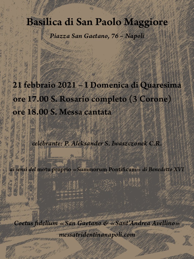 Napoli, 21 febbraio 2021, I Domenica di Quaresima, Basilica di San Paolo Maggiore, ore 18.00: S. Messa cantata in Rito Romano antico Immagine20 febbraio 2021messatridentinanapoli Lascia un commento