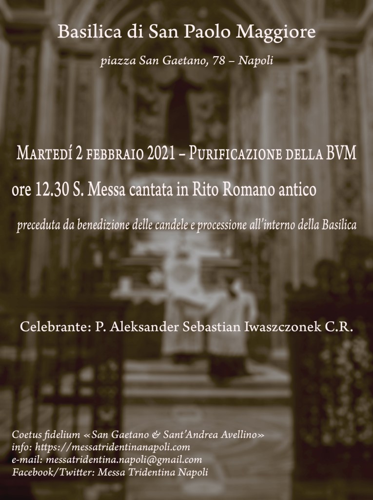 Napoli, Martedí 2 febbraio 2021, Purificazione della BVM (‘Candelora’), Basilica di San Paolo Maggiore, ore 12.30: Benedizione delle candele, processione e S. Messa cantata in Rito Romano antico