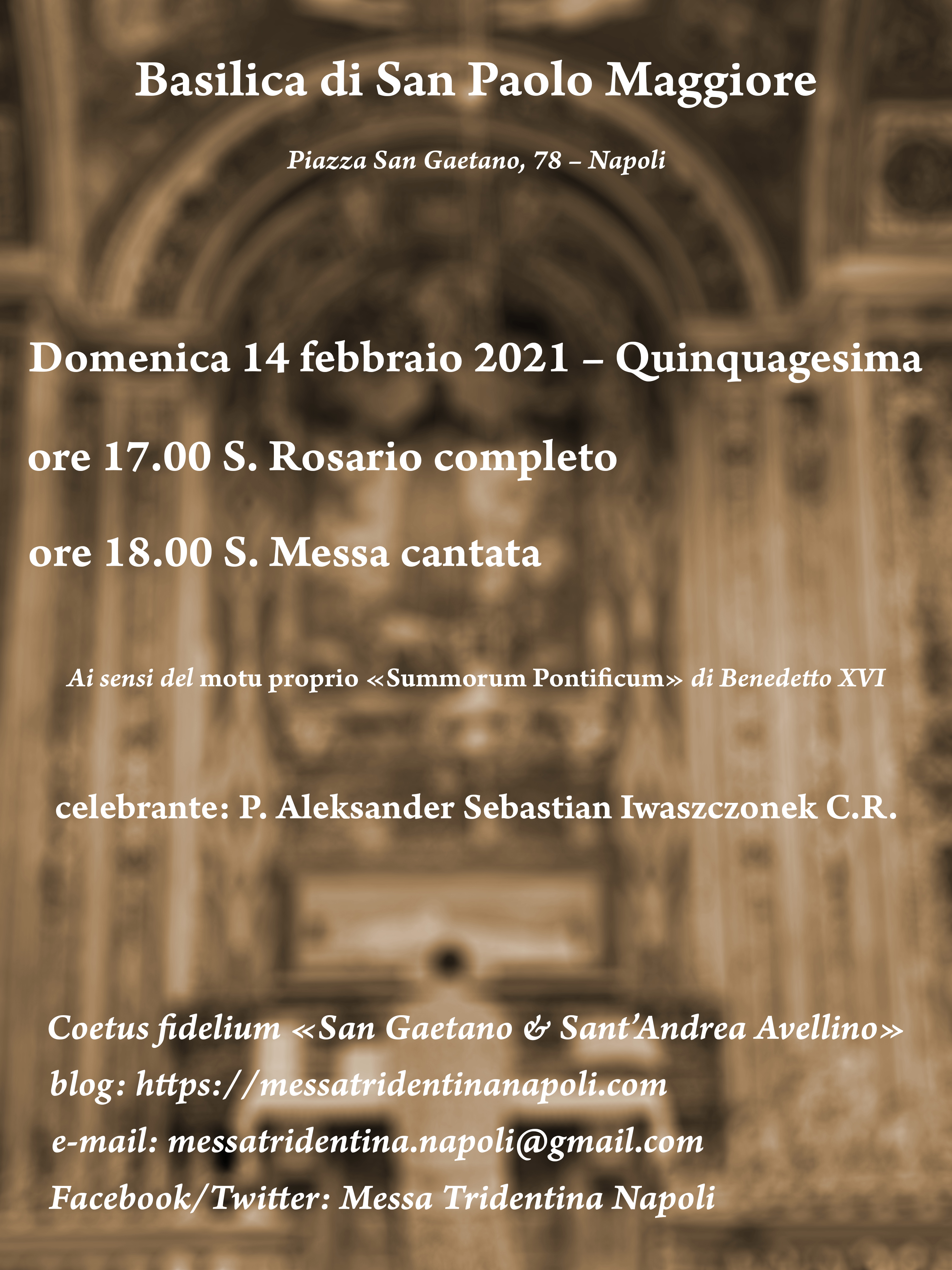 Napoli, Domenica 14 febbraio 2021 (Quinquagesima), Basilica di San Paolo Maggiore, ore 18.00: S. Messa cantata in Rito Romano antico Immagine13 febbraio 2021messatridentinanapoli Lascia un commento Condividi: Fai clic per condividere su X (Si apre in una nuova finestra) X Fai clic per condividere su Facebook (Si apre in una nuova finestra) Facebook Fai clic per condividere su Telegram (Si apre in una nuova finestra) Telegram Fai clic per condividere su WhatsApp (Si apre in una nuova finestra) WhatsApp Mi piace Caricamento... Correlati
