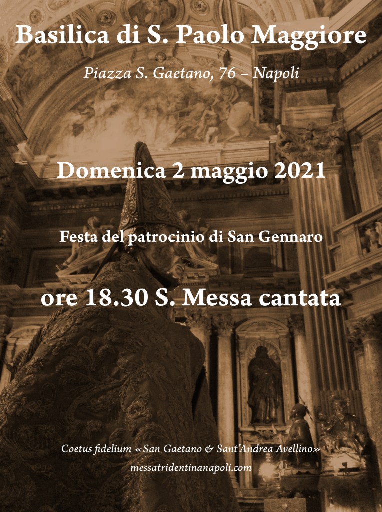 Napoli, Domenica 2 maggio 2021, festa della Traslazione delle Reliquie di San Gennaro: S. Messa in Rito Romano antico Immagine1 Maggio 20211 Maggio 2021messatridentinanapoli Lascia un commento Errata corrige: Secondo il calendario della Diocesi di Napoli, la prima domenica di maggio cade la festa della Traslazione delle Reliquie di San Gennaro, non del Patrocinio (16 dicembre). Mi scuso per l’errore. Condividi: Fai clic per condividere su X (Si apre in una nuova finestra) X Fai clic per condividere su Facebook (Si apre in una nuova finestra) Facebook Fai clic per condividere su Telegram (Si apre in una nuova finestra) Telegram Fai clic per condividere su WhatsApp (Si apre in una nuova finestra) WhatsApp Mi piace Caricamento... Correlati