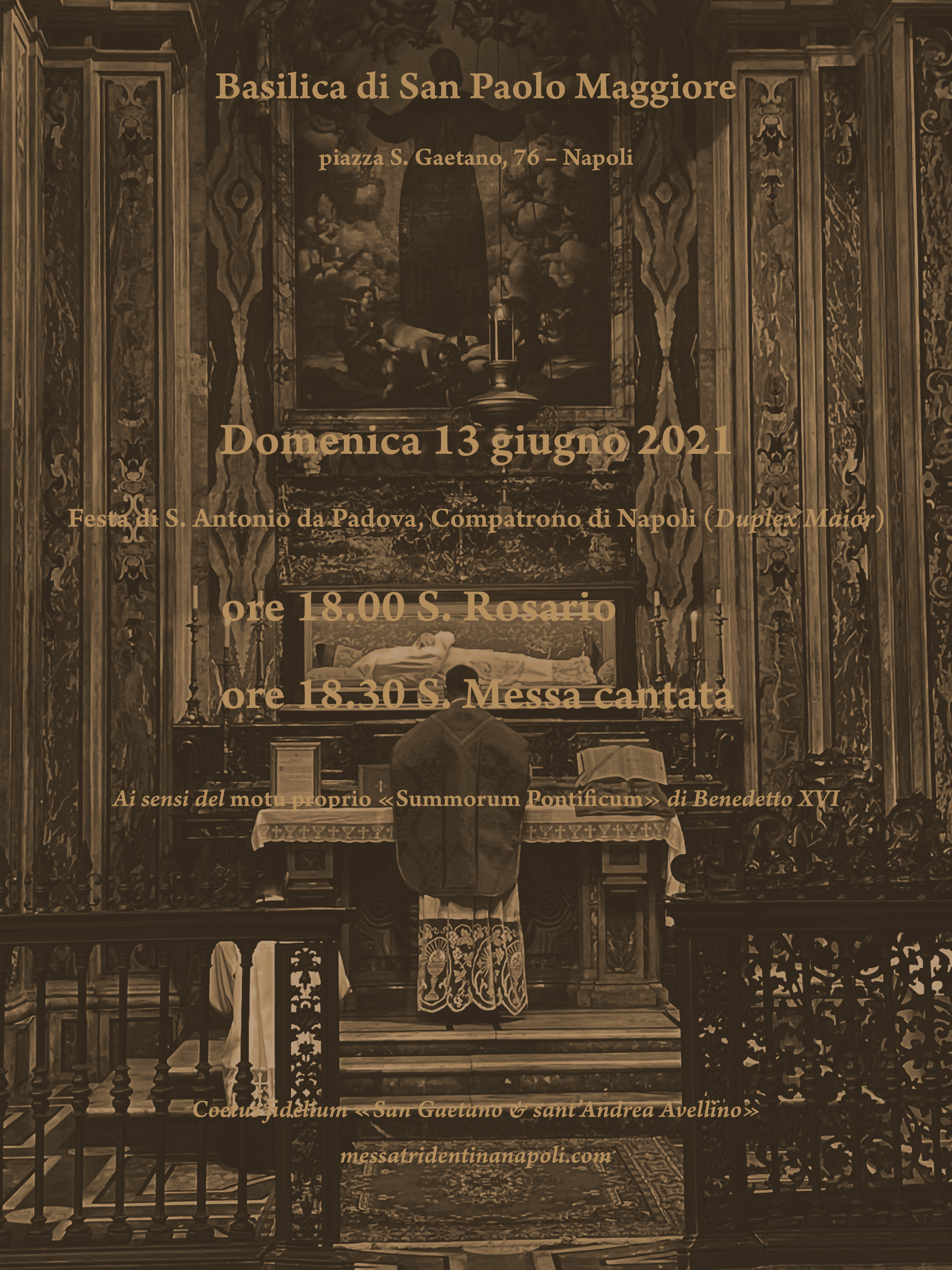 Domenica 13 giugno 2021, festa di Sant’Antonio di Padova, Compatrono di Napoli (Duplex Maior): S. Messa cantata in Rito Romano antico 12 giugno 202112 giugno 2021messatridentinanapoli Lascia un commento