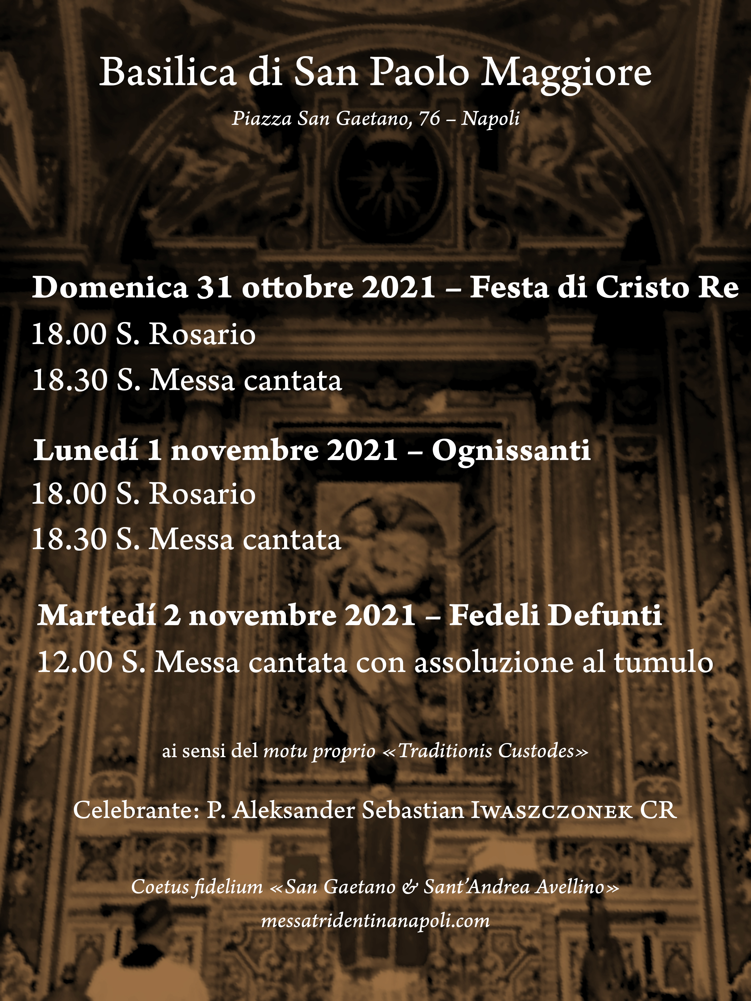Domenica 31 ottobre, 1 e 2 novembre: SS. Messe in Rito Romano antico nella Basilica di San Paolo Maggiore Immagine30 ottobre 2021messatridentinanapoli Lascia un commento Condividi: Fai clic per condividere su X (Si apre in una nuova finestra) X Fai clic per condividere su Facebook (Si apre in una nuova finestra) Facebook Fai clic per condividere su Telegram (Si apre in una nuova finestra) Telegram Fai clic per condividere su WhatsApp (Si apre in una nuova finestra) WhatsApp Mi piace Caricamento... Correlati