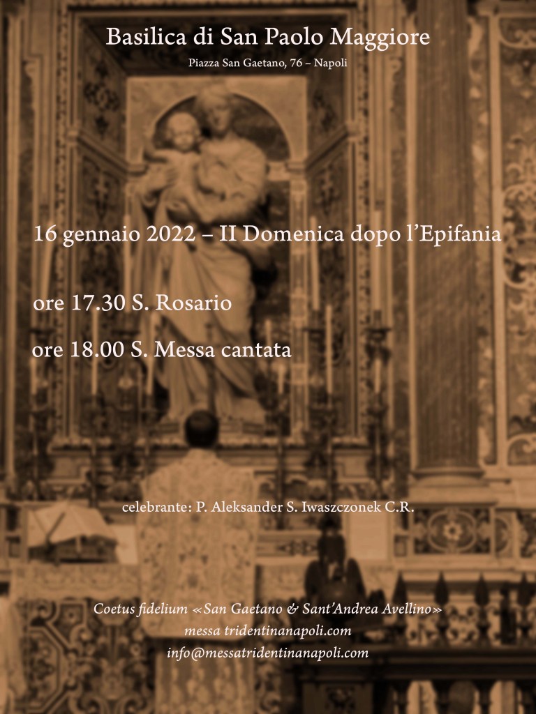 16 gennaio 2022, II Domenica dopo l’Epifania: S. Messa cantata in Rito Romano antico Immagine15 gennaio 2022messatridentinanapoli Lascia un commento Condividi: Fai clic per condividere su X (Si apre in una nuova finestra) X Fai clic per condividere su Facebook (Si apre in una nuova finestra) Facebook Fai clic per condividere su Telegram (Si apre in una nuova finestra) Telegram Fai clic per condividere su WhatsApp (Si apre in una nuova finestra) WhatsApp Mi piace Caricamento... Correlati