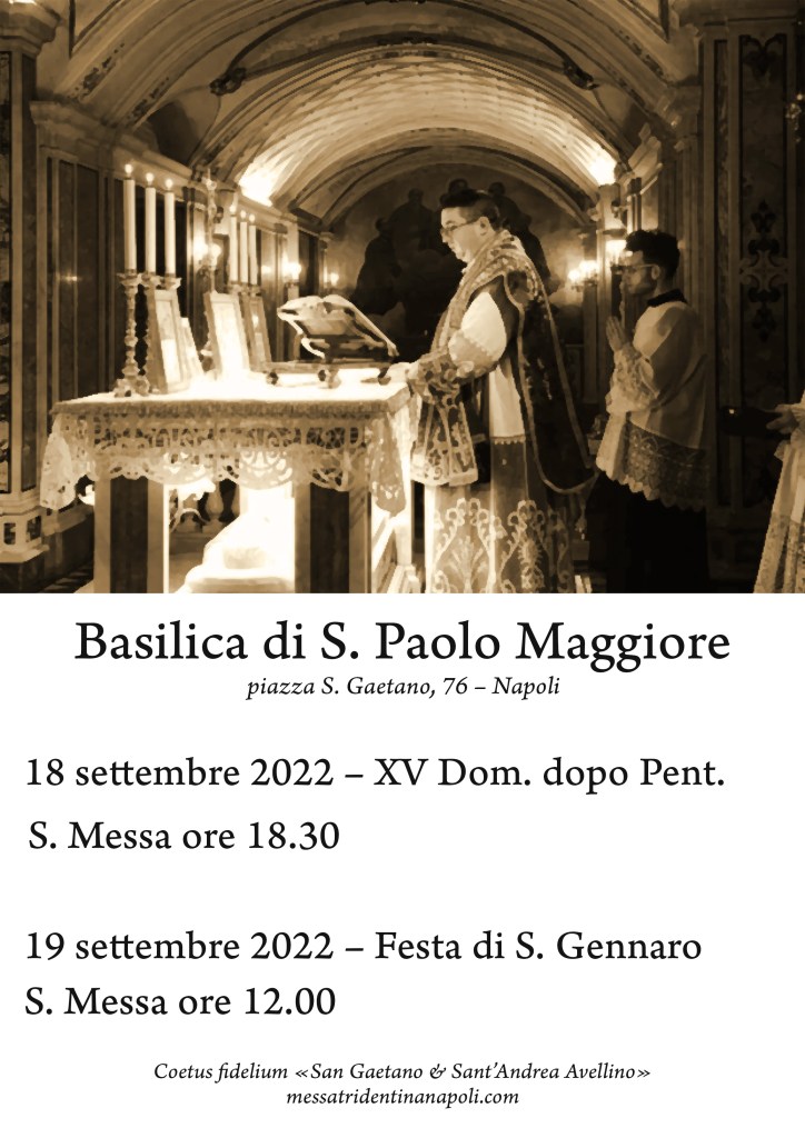 Si avvisano i fedeli che dal 14 al 21 settembre sarà celebrato un ottavario di SS. Messe in Rito Romano antico per i benefattori che hanno contribuito alle spese per il restauro della antica croce astile della Basilica di San Paolo Maggiore. Le celebrazioni avranno luogo alle ore 12.00, con la sola eccezione di domenica 18 (Messa ore 18.30). Seguirà piú avanti specifico avviso.