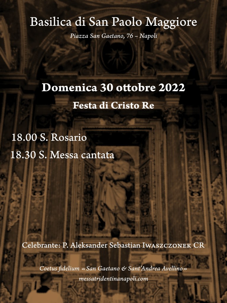 Domenica 30 ottobre 2022, Festa di Cristo Re: S. Messa cantata in Rito Romano antico, ore 18.30 Immagine29 ottobre 2022messatridentinanapoli Lascia un commento Condividi: Fai clic per condividere su X (Si apre in una nuova finestra) X Fai clic per condividere su Facebook (Si apre in una nuova finestra) Facebook Fai clic per condividere su Telegram (Si apre in una nuova finestra) Telegram Fai clic per condividere su WhatsApp (Si apre in una nuova finestra) WhatsApp Mi piace Caricamento... Correlati