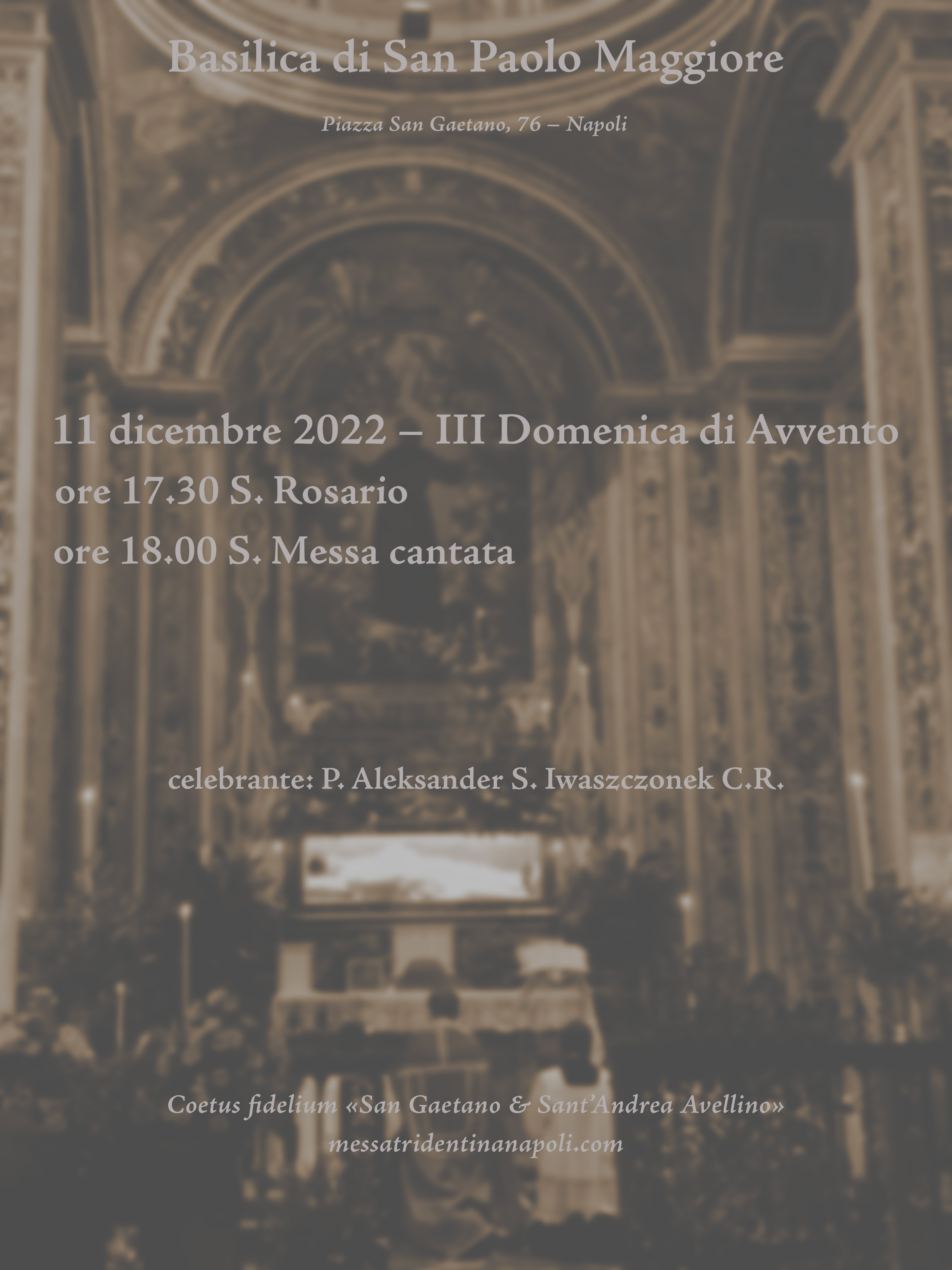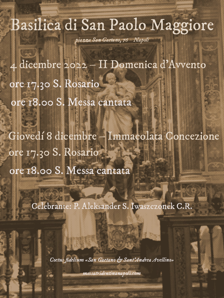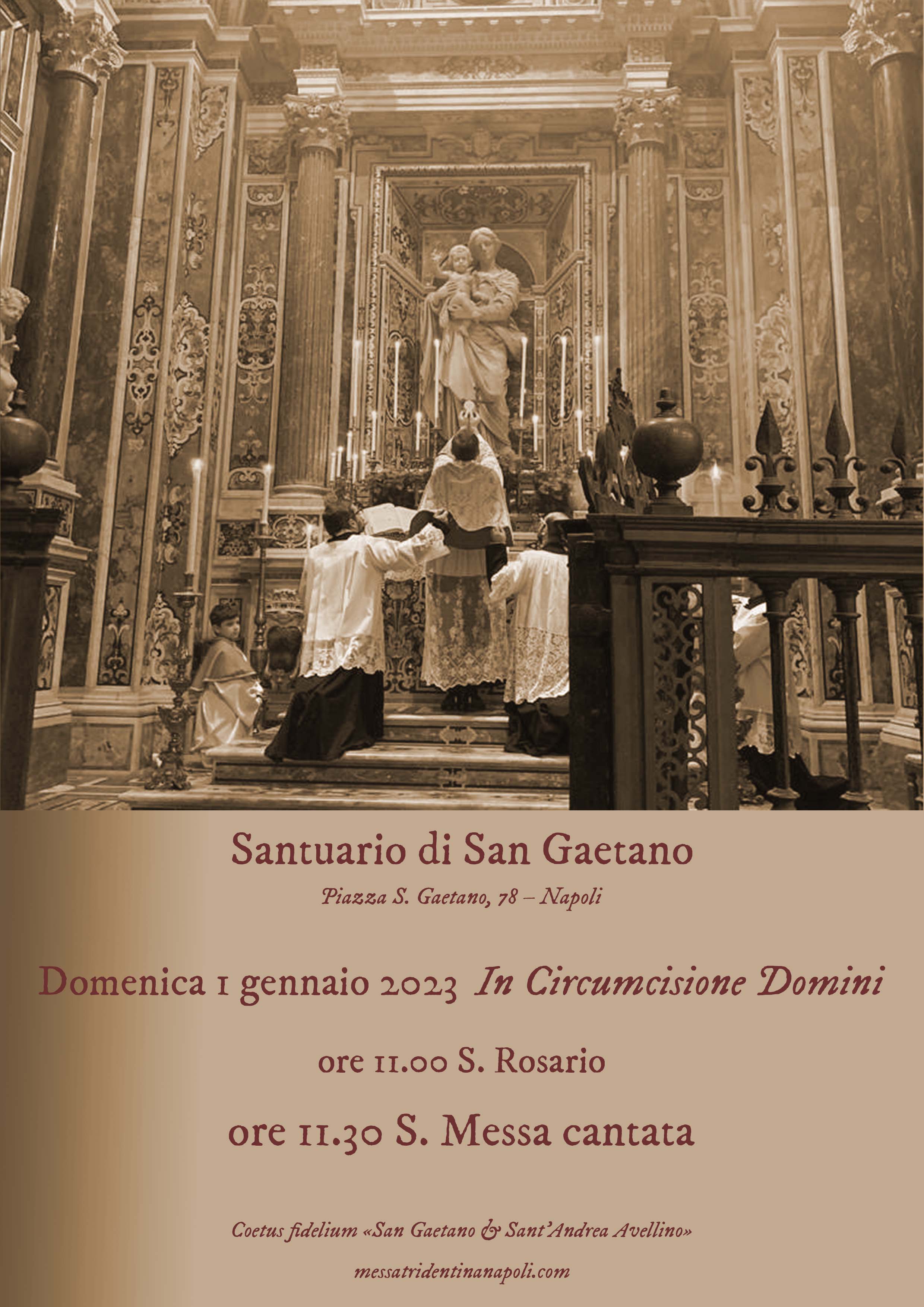 Domenica 1 gennaio 2023 la S. Messa tradizionale sarà celebrata eccezionalmente alle ore 11.30 nel Santuario di San Gaetano. Dal giorno dell’Epifania (6 gennaio) si tornerà all’orario e luogo consueto (ore 18.00, Basilica di San Paolo Maggiore).