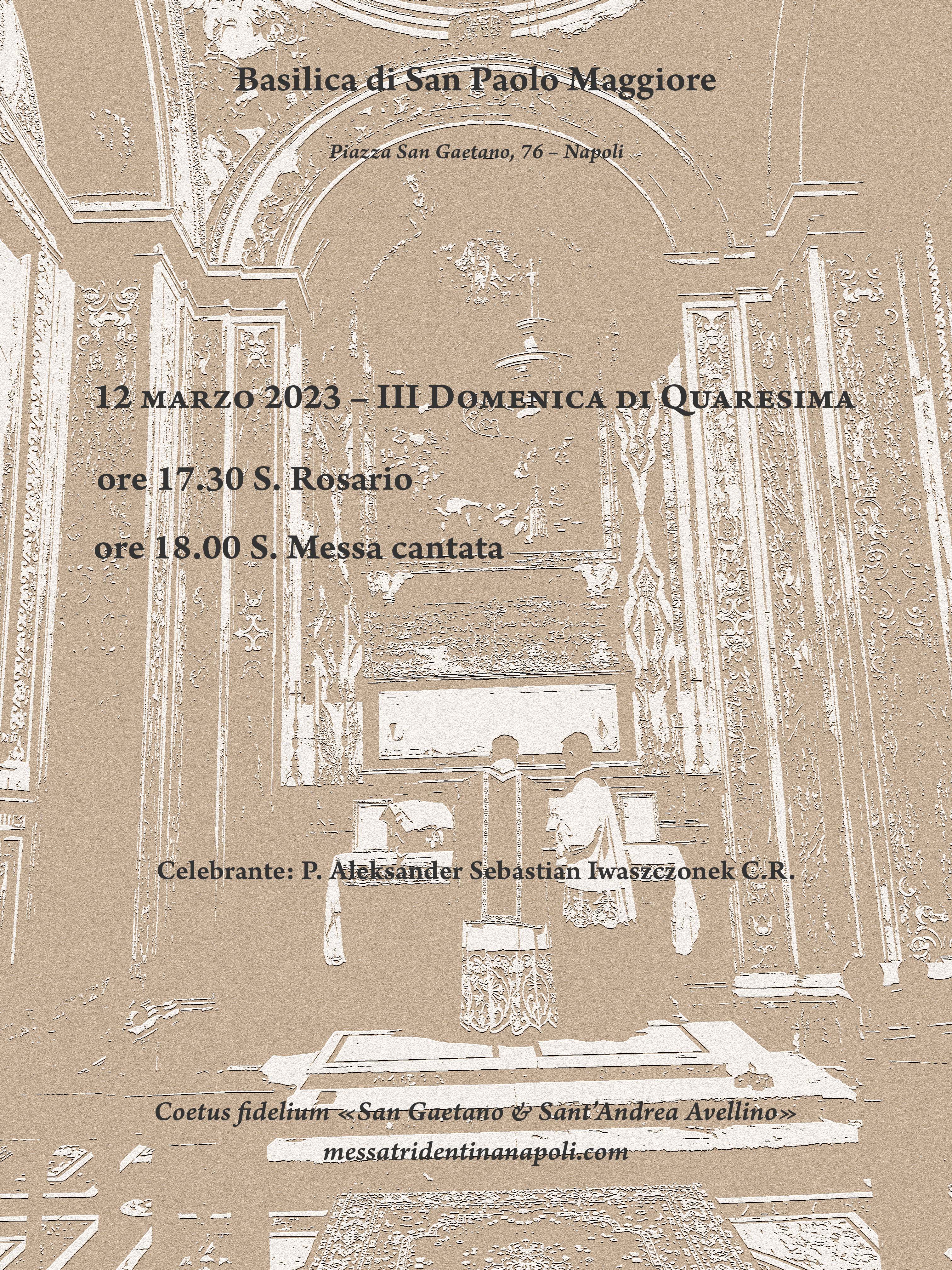 12 marzo 2023, III Domenica di Quaresima: S. Messa cantata in Rito Romano antico Immagine11 marzo 2023messatridentinanapoli Lascia un commento