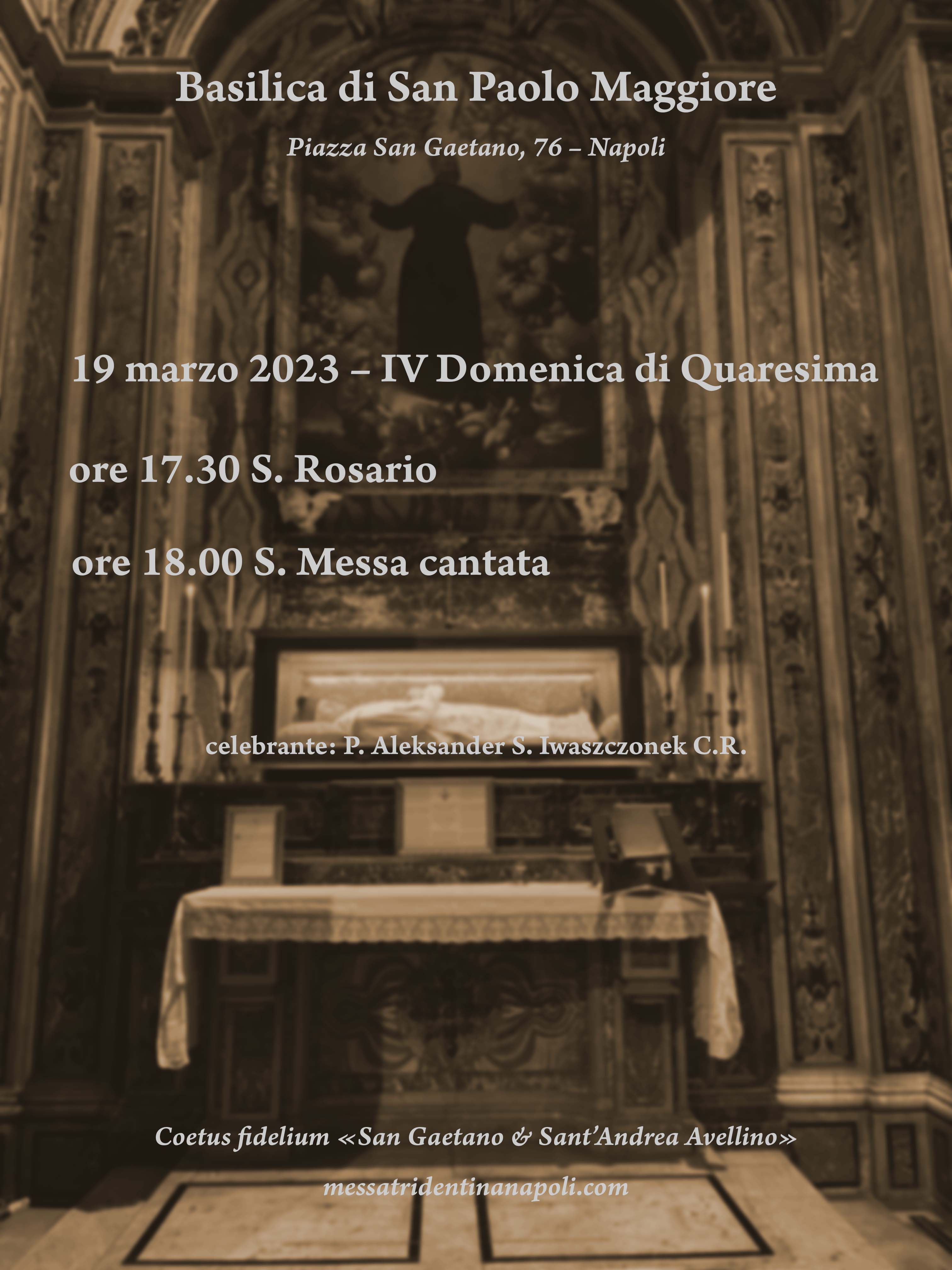 19 marzo 2023, IV Domenica di Quaresima: S. Messa cantata in Rito Romano antico Immagine18 marzo 2023messatridentinanapoli Lascia un commento