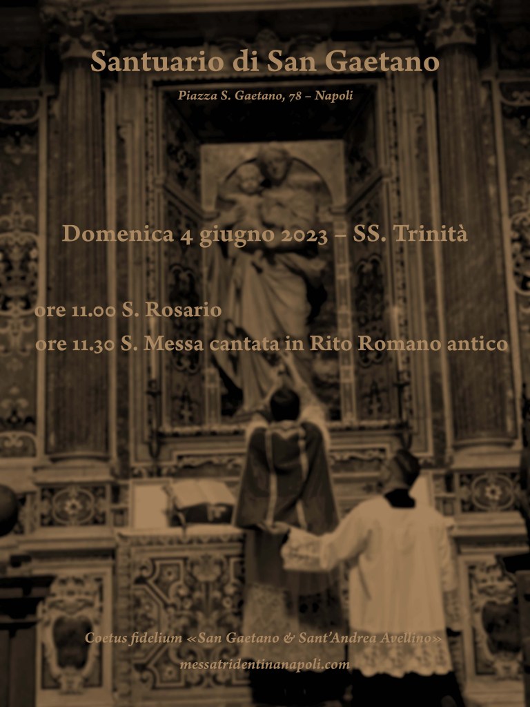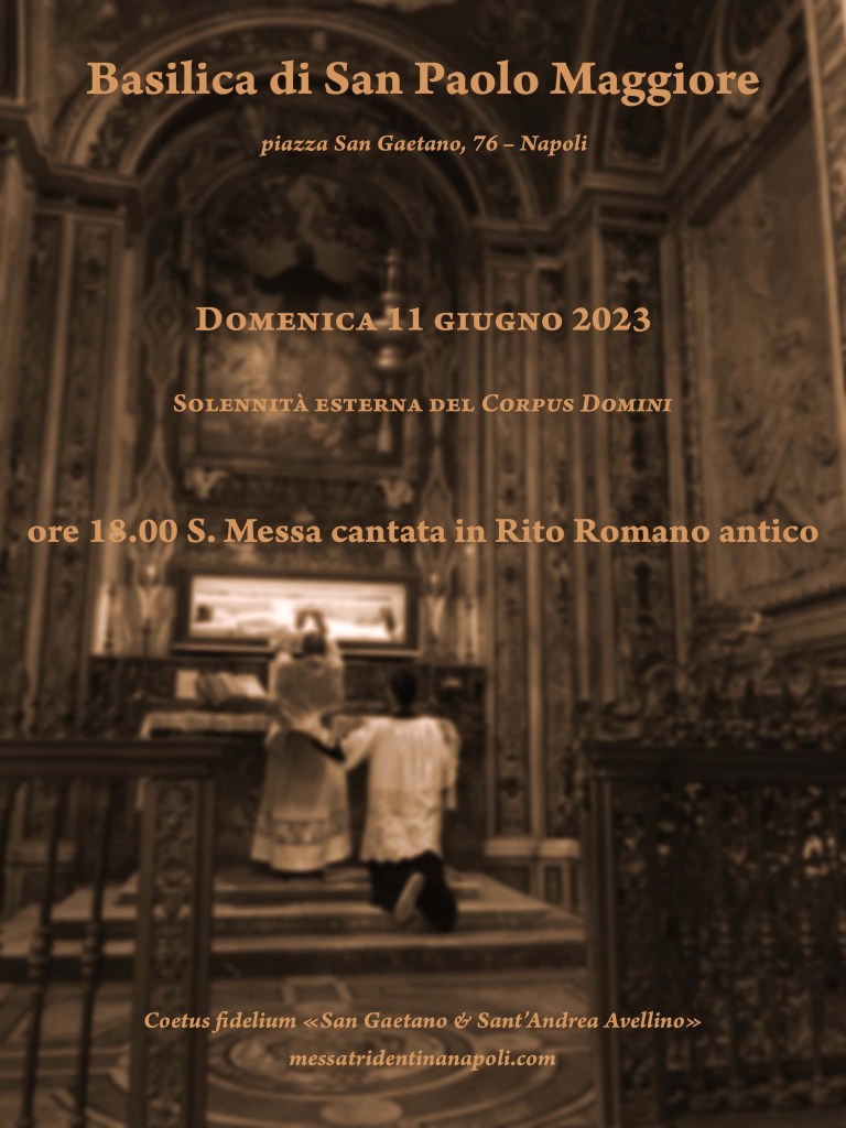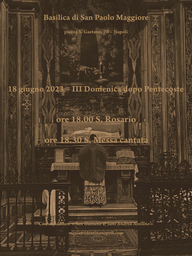 N.B. Si ricorda che sabato 24 giugno, alle ore 11.30, avrà luogo l’ordinazione diaconale di Don Wiktor Wójcik C.R., presieduta da Sua Ecc.za Rev.ma Mons. Francesco Beneduce, Vescovo Ausiliare di Napoli (https://messatridentinanapoli.com/2023/06/19/sabato-24-giugno-2023-ore-11-30-basilica-di-san-paolo-maggiore-ordinazione-diaconale-di-don-wiktor-c-wojcik-chierico-regolare-teatino/)