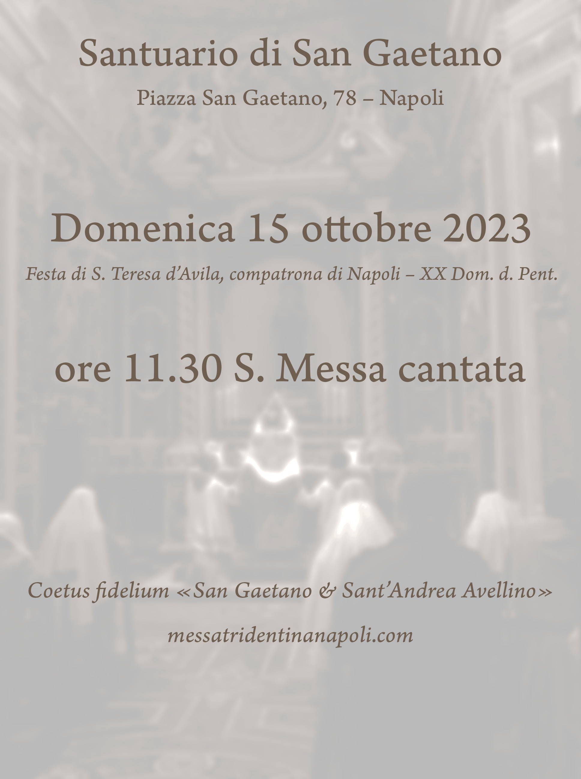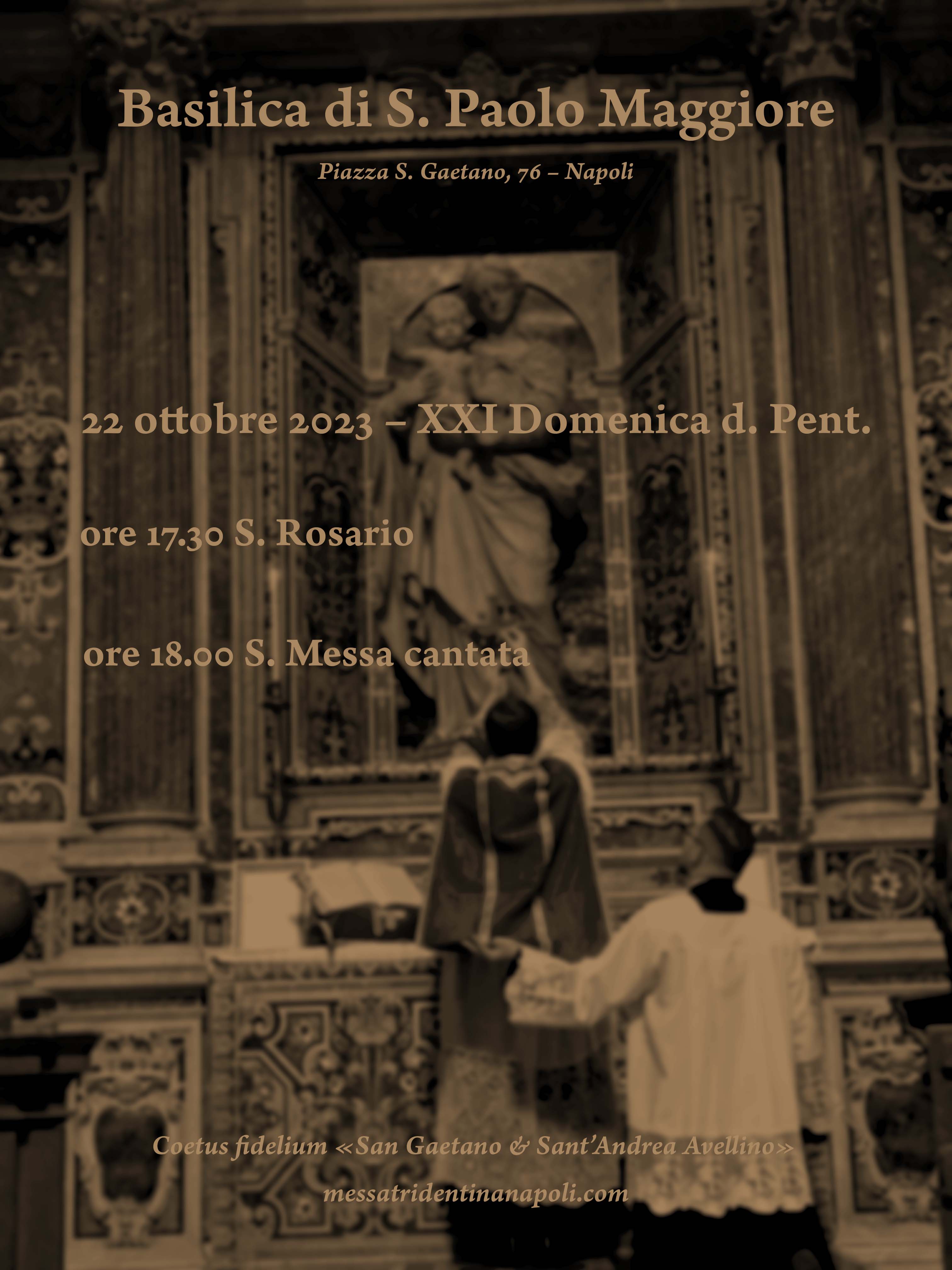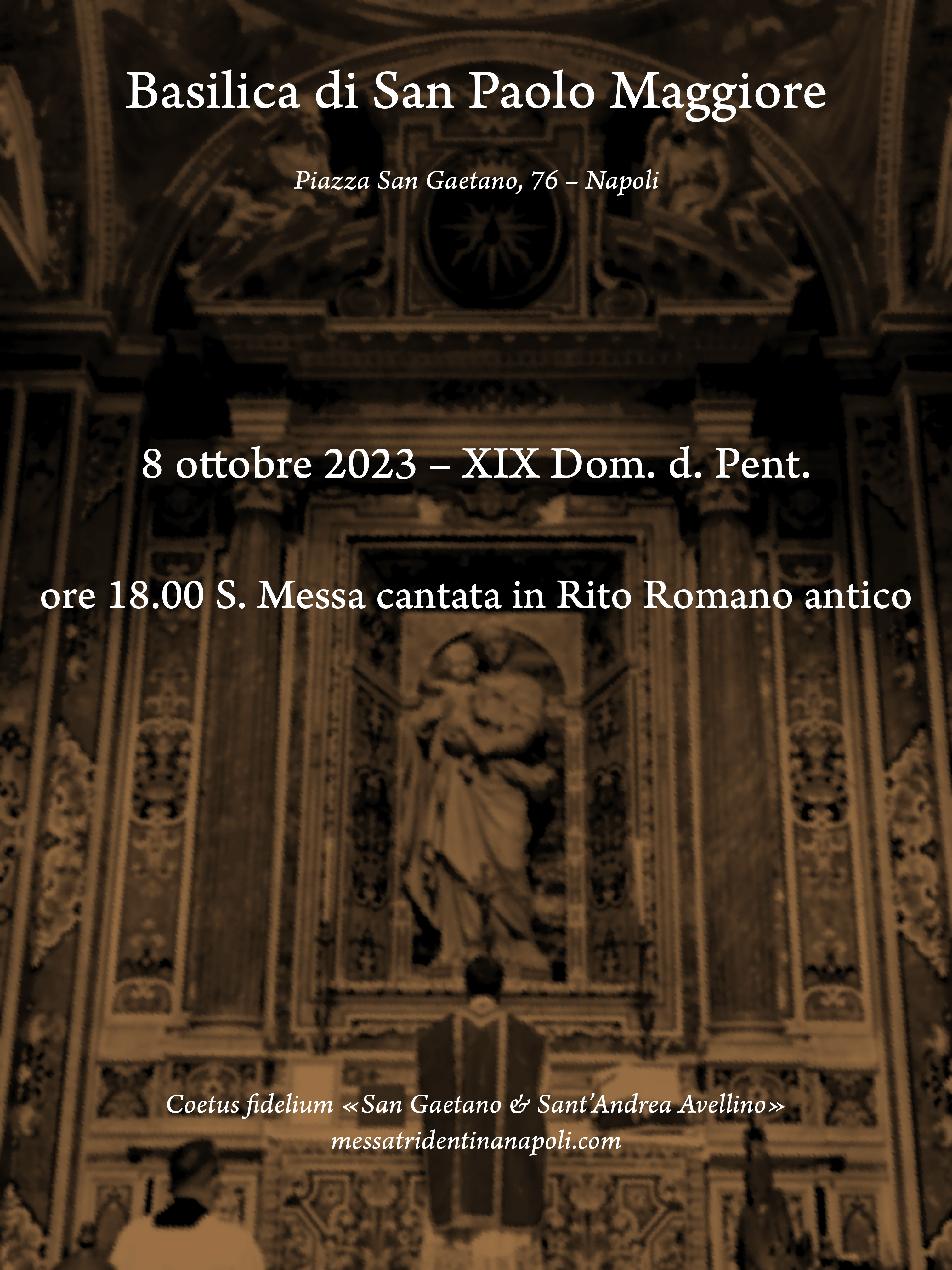 N.B. Il pomeriggio della prossima domenica 15 ottobre la Basilica di San Paolo Maggiore sarà sede di una manifestazione culturale di carattere musicale; la S. Messa tradizionale è pertanto anticipata al mattino, alle ore 11.30, nel Santuario di San Gaetano.