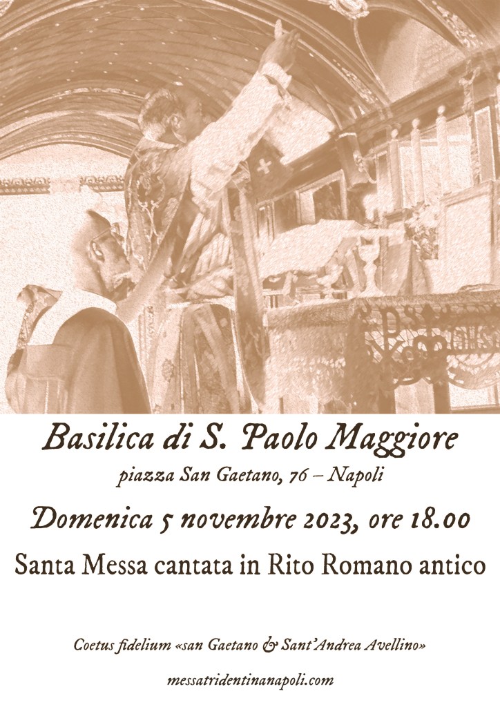 5 novembre 2023, XXIII Domenica dopo Pentecoste: S. Messa cantata in Rito Romano antico, ore 18.00 Immagine4 novembre 2023messatridentinanapoli Lascia un commento Condividi: Fai clic per condividere su X (Si apre in una nuova finestra) X Fai clic per condividere su Facebook (Si apre in una nuova finestra) Facebook Fai clic per condividere su Telegram (Si apre in una nuova finestra) Telegram Fai clic per condividere su WhatsApp (Si apre in una nuova finestra) WhatsApp Mi piace Caricamento... Correlati