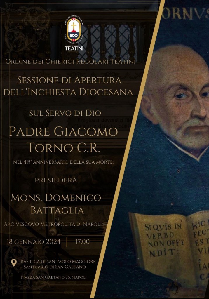 Condivido con Voi una bellissima notizia: domani, giovedí 18 gennaio 2024, nella Basilica di San Paolo Maggiore, alle ore 17.00, verrà ufficialmente aperta, alla presenza dell’Arcivescovo di Napoli Domenico Battaglia, la causa di beatificazione del Ven. Giacomo Torno (1539?- 18 gennaio 1609), sacerdote napoletano dell’Ordine dei Chierici Regolari Teatini, confessore di Sant’Andrea Avellino, il cui corpo incorrotto si venera nel Santuario di San Gaetano (= cripta della Basilica di San Paolo Maggiore). Deo gratias!
