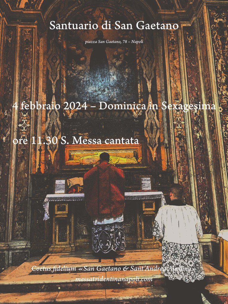 4 febbraio 2024, Domenica di Sessagesima: S. Messa cantata in Rito Romano antico nel Santuario di San Gaetano Immagine3 febbraio 2024messatridentinanapoli Lascia un commento Condividi: Fai clic per condividere su X (Si apre in una nuova finestra) X Fai clic per condividere su Facebook (Si apre in una nuova finestra) Facebook Fai clic per condividere su Telegram (Si apre in una nuova finestra) Telegram Fai clic per condividere su WhatsApp (Si apre in una nuova finestra) WhatsApp Mi piace Caricamento... Correlati